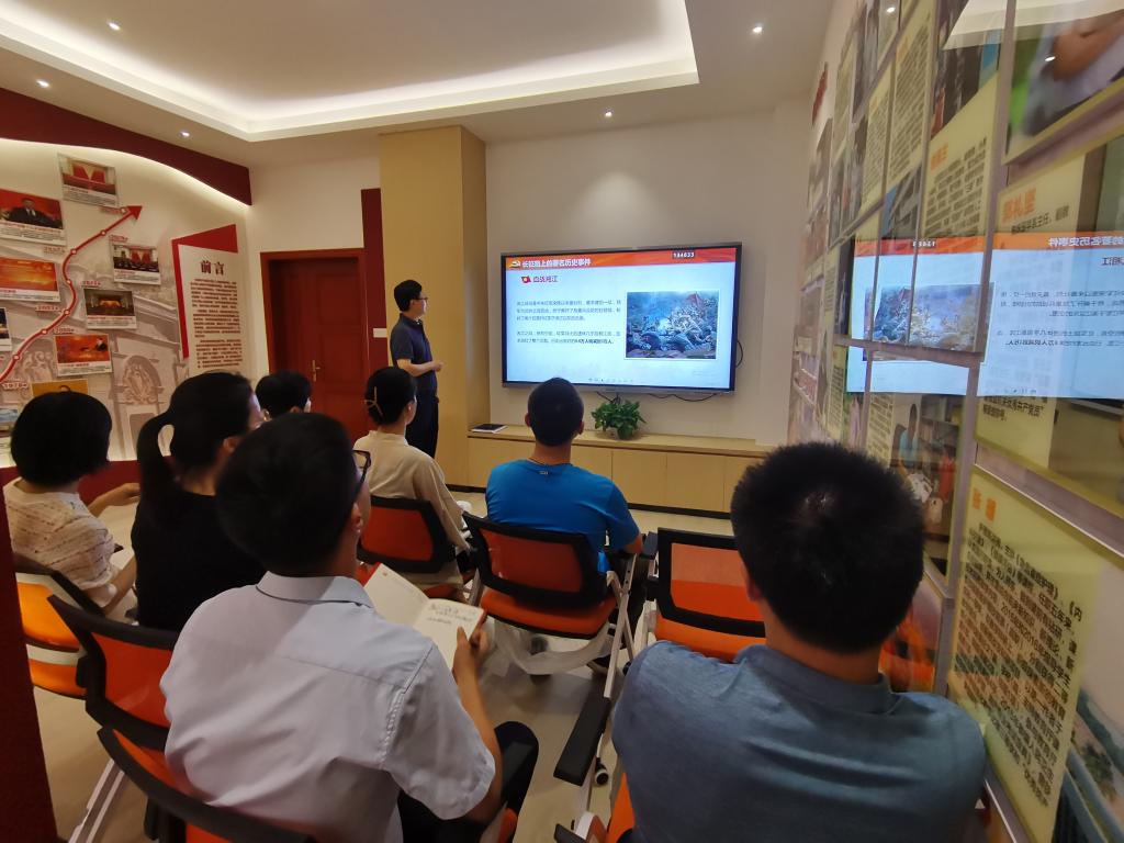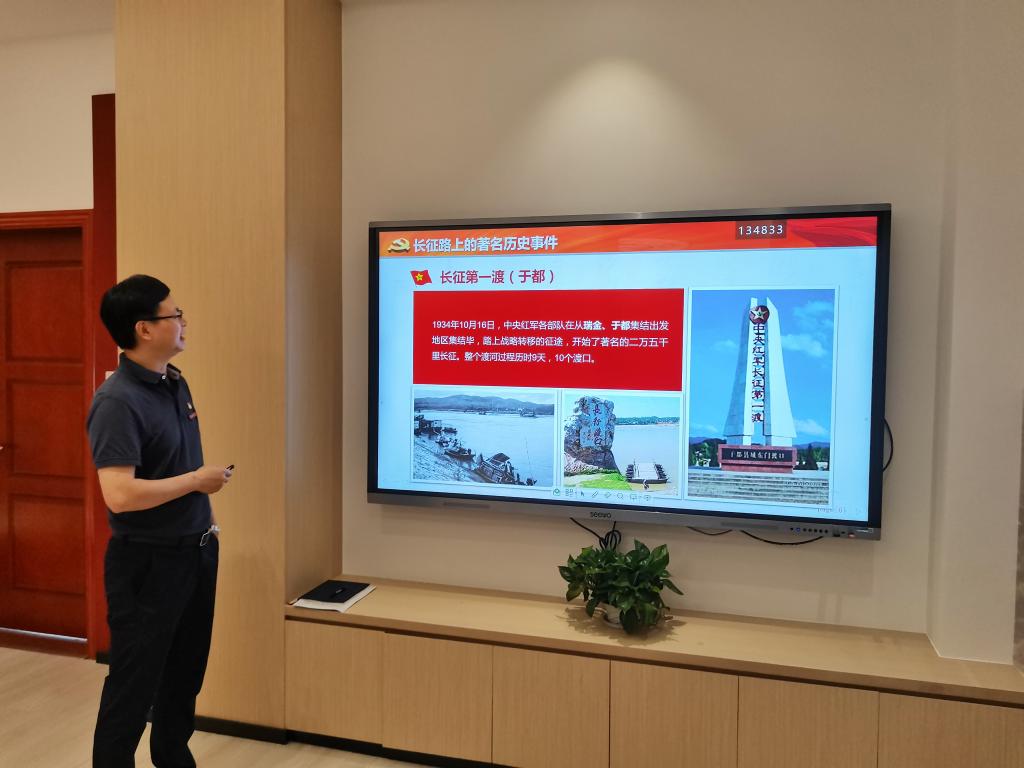 叶海书记给全体党员同志们讲述了长征历史简介、回顾长征路上“血战湘江、遵义会议、四渡赤水、巧渡金沙江、飞夺泸定桥”等著名历史事件,概括了长征精神的主要内涵——乐于吃苦、勇于战斗、重于求实、善于团结。