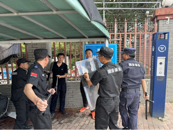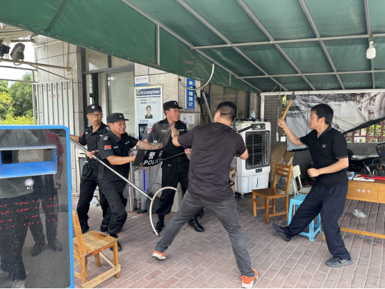 上午10时许,演练正式开始。第一轮,保安副队长一人扮演持器械“歹徒”,手持“凶器”试图强行闯入学校东南门,此时有可能对师生的安全造成威胁。东南门岗一名保安上前盘问,另一名保安发现异常情况后,根据反恐防暴应急预案,立即通知保安队长,其他岗位保安在队长步话机“呼叫”下,手持棍棒、钢叉等反恐防暴工具立刻赶到东南门现场,与“歹徒”周旋,竭力阻止“歹徒”入校,并将“歹徒”逼到死角围住。在几名保安协同配合下,短短的1分多钟就制服了“歹徒”,夺下“凶器”。第二轮,我处一名老师与保安副队长2人一起扮演持器械“歹徒”,手持“凶器”试图强行闯入学校东南门。开云保安按照上述流程再演练一次。