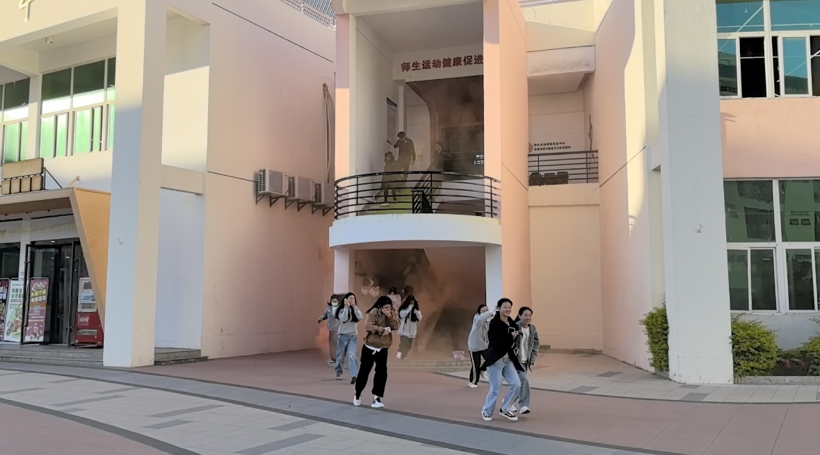 应急逃生演练(消防、地震)前,由安全工作处黄兴宇副处长讲授介绍灭火器使用注意事项和应急逃生演练疏散路线,提醒广大师生听从指挥、有序撤离,防止出现推搡、踩踏事故;各位置工作人员提前到岗,认真履责,确保撤离安全有序。演练开始,演练工作组接到演练指令后,模拟燃放烟雾,工作人员迅速组织学生依次从二楼师生运动健康促进中心撤出,按照指定路线,分别有序从楼梯通道内侧撤离,做到弯腰、捂口鼻、迅速有序,到仁心食堂门口的空地集合并清点人数。