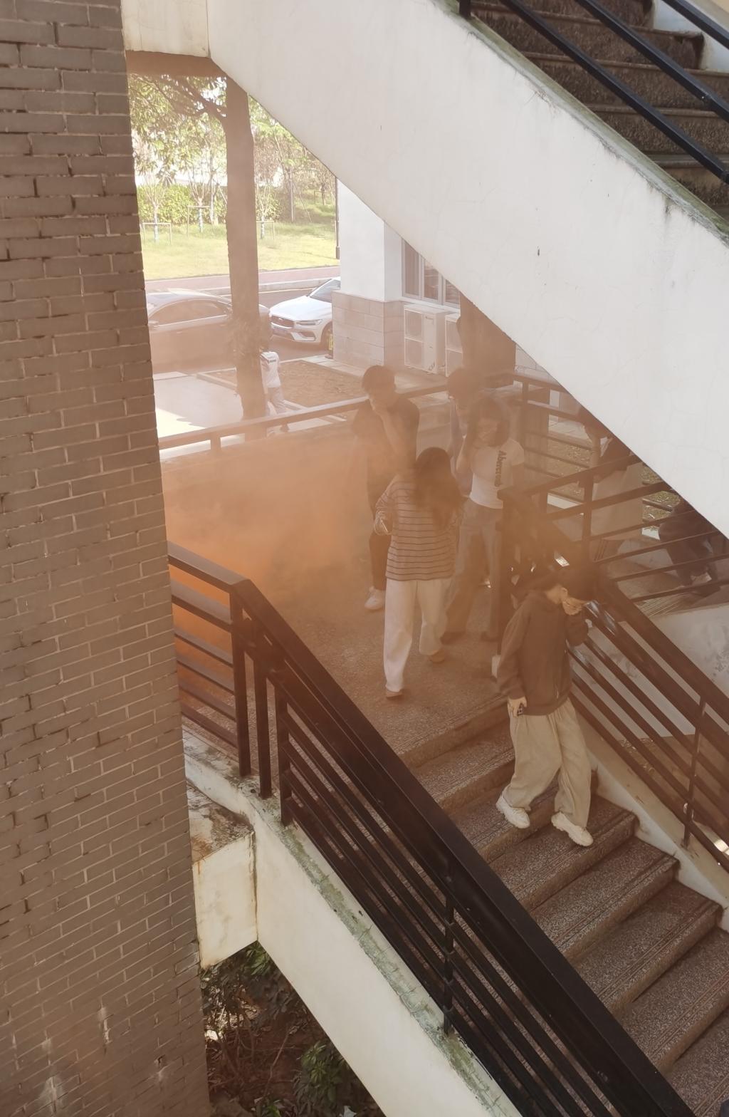 第二部分应急逃生演练(消防、地震)。演练开启前安全工作处林泽文先详细介绍消防器材的使用、演练程序、疏散信号、疏散路线、疏散顺序等注意事项,并强调在疏散过程中切勿拥挤、推搡导致踩踏事件发生。演练工作组接到演练指令后,燃放烟雾,平静的医工学院楼突然黄烟四起、警报铃响,各位老师迅速到达指定岗位,学生们也随之做出反应,在现场人员的指挥下,学生们纷纷用手、湿纸巾等捂住口鼻,弯着腰从预定的逃生路线进行撤离,撤退中所有同学紧靠右行,撤退过程井然有序,参加本次演练师生全部安全撤离到指定区域。
