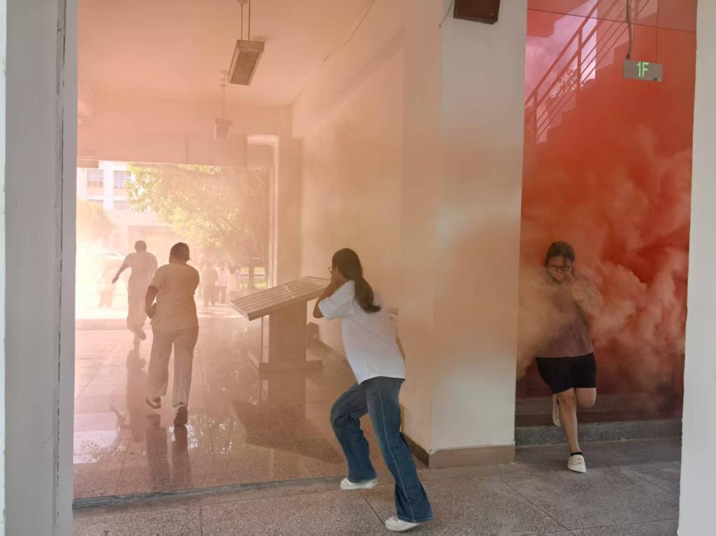 第二部分应急逃生演练(消防、地震)。演练开启前安全工作处林泽文先详细介绍消防器材的使用、演练程序、疏散信号、疏散路线、疏散顺序等注意事项,并强调在疏散过程中切勿拥挤、推搡导致踩踏事件发生。各位置工作人员提前到岗,认真履责,确保撤离安全有序。演练开始,安全工作处演练工作组接到演练指令后,模拟燃放烟雾,工作人员组织学生依次从实训(验)室撤出,按照指定路线,分别有序从楼梯通道内侧撤离,做到弯腰、捂口鼻、迅速有序,到一层大厅集合并清点人数。