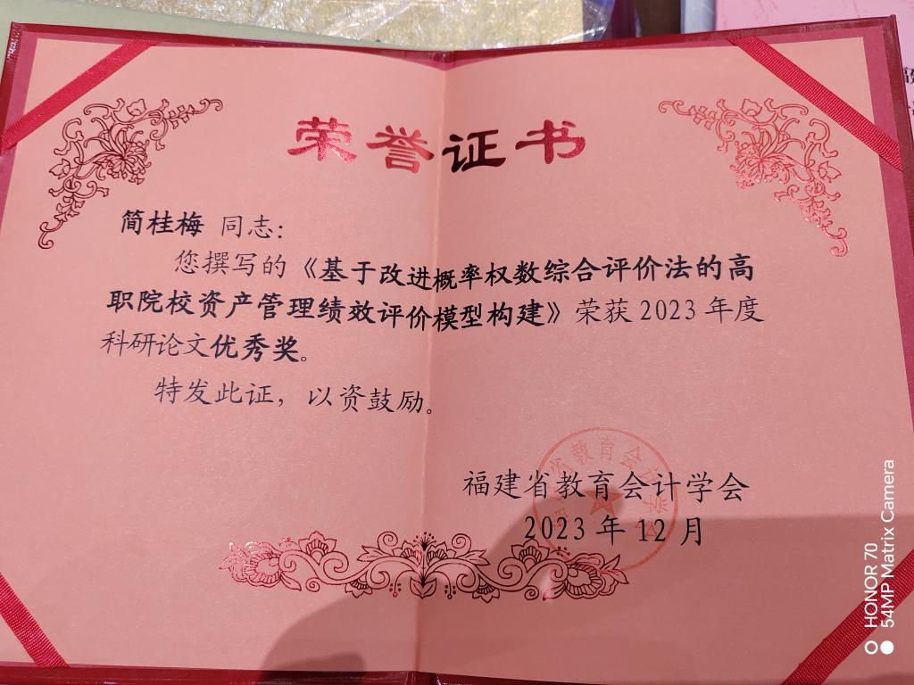 近日,福建省教育会计学会对全省高校财务工作先进单位及个人进行了表彰。开云财务处获得“2022-2023年度学会工作先进财会单位”称号,财务处简桂梅同志撰写的《基于改进概率权数综合评价法的高职院校资产管理绩效评价模型构建》荣获2023年度科研论文优秀奖。