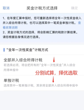 点击“工资薪金”-“全年一次性奖金”计税方式有“全部并入综合所得计税”和“单独计税”两种,可以分别试算,选最优方式。