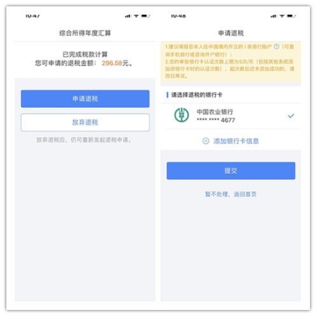 (七)完成税款计算后,可查看退税金额,点击“申请退税”,并选择退税银行卡。