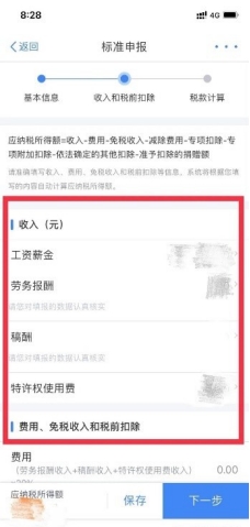 (六)查看“收入和税前扣除”信息,包括工资薪金、劳务报酬、稿酬和特许权使用费,点击最后的箭头可查看每种收入的明细。确认无误后点击“下一步”。