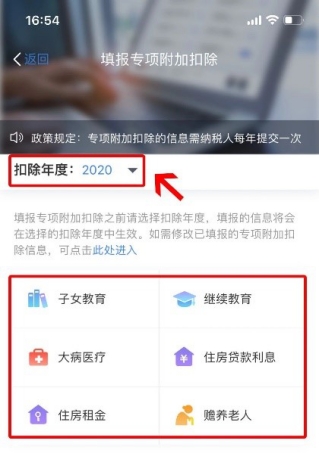 第二步:选择扣除年度“2020”,再选择需要填写或修改的专项附加扣除。