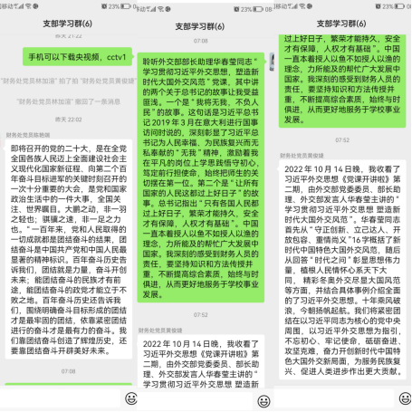 在喜迎党的二十大胜利召开之际,为深入学习贯彻习近平新时代中国特色社会主义思想,财务处全体党员10月15日晚在家中观看了CCTV1《党课开讲啦》节目中,外交部部长助理华春莹同志讲授的《学习贯彻习近平外交思想,塑造新时代大国外交风范》专题党课。