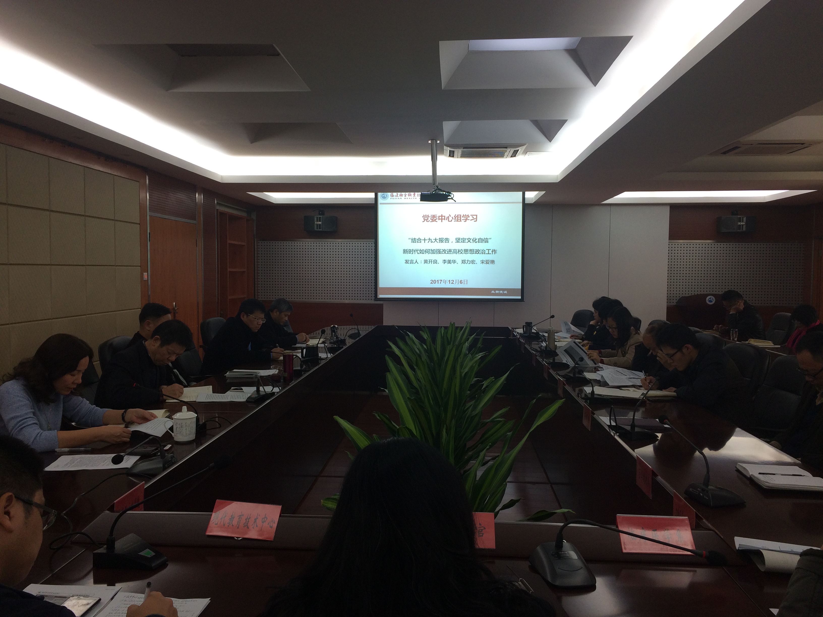 12月7日下午,我院在行政楼四楼第一会议室组织召开党委中心组学习(扩大)会议,围绕“结合党的十九大报告,坚定文化自信”主题,畅谈新时代如何加强改进高校思想政治工作。会议由党委书记曾武祈主持,全体中层以上干部共50余人参会。