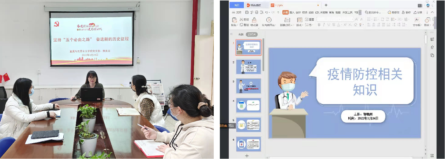 党员教师们将伟大的抗疫精神融入党性教育中,将疫情时刻的危机转化为课程思政的契机。直属马克思主义学院党支部书记熊美兰为全体党员教师开讲《坚持“五个必由之路”奋进新的历史征程》主题党课,并通过课程集备,讨论在课堂内容中充分融入抗疫素材,将抗疫先进事迹和理想信念教育有机融合,同时对学生做好心理疏导和正面引导,鼓励学生以积极的态度同心战“疫”。药学院第一党支部结合疫情防控工作组织线上党日活动,开展“抗击疫情 奉献有我”防疫宣讲,并联合药学院团总支举办防疫知识竞赛送香囊活动,通过活动引导学生树立“从我做起,积极防疫”的意识,肩负起疫情防控的使命。