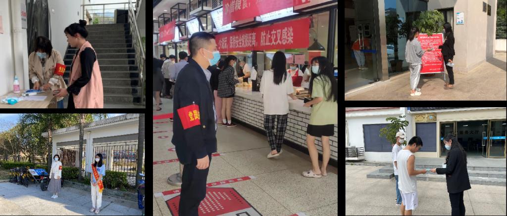 做好督导宣传,稳定校内秩序。院直机关党员同志们在食堂、快递驿站、超市等校内人流量大的区域迅速集结,主动开展党员志愿服务,积极投入到秩序维护、防疫督导等各项工作中;各院系党员突击队深入学生宿舍,进行线上教学督查;深入学生服务中心、图书馆等场所,督导学生规范佩戴口罩,严格执行校内防疫制度。各级党组织凝聚力量,共同努力,充分发挥“一名党员一面旗”的作用。