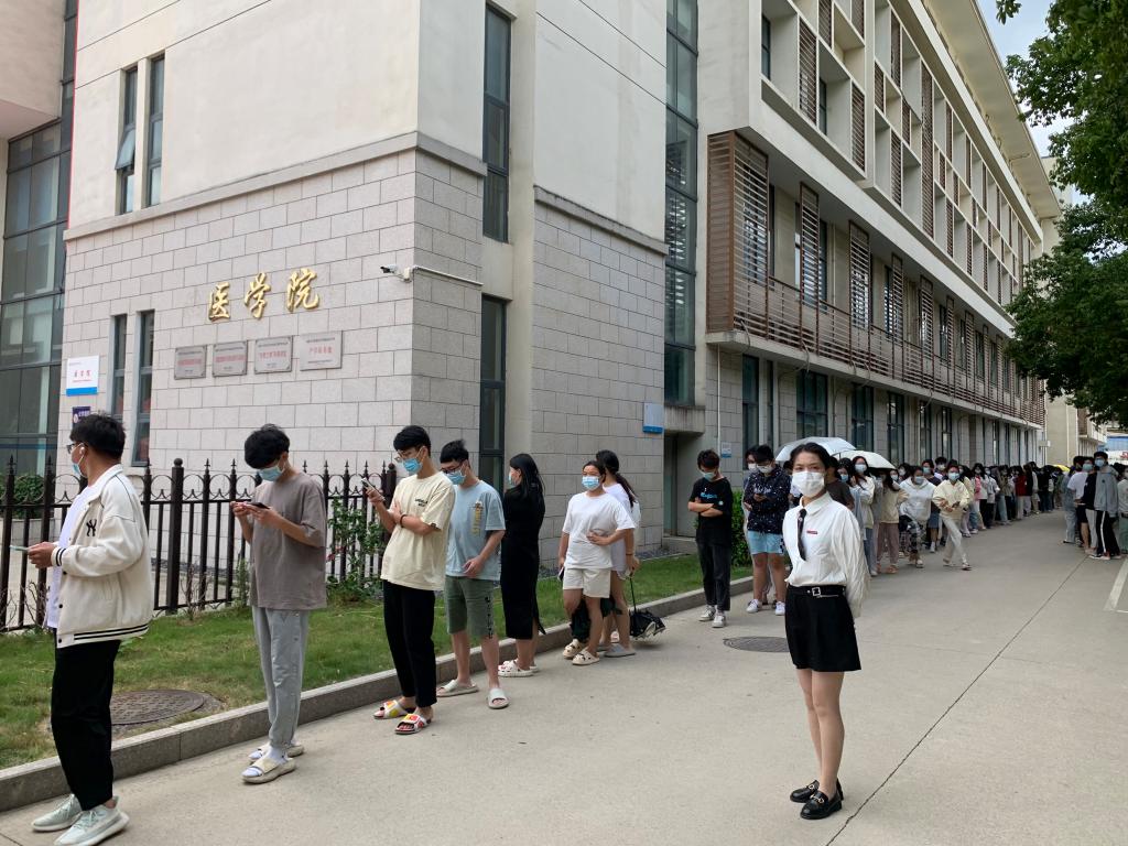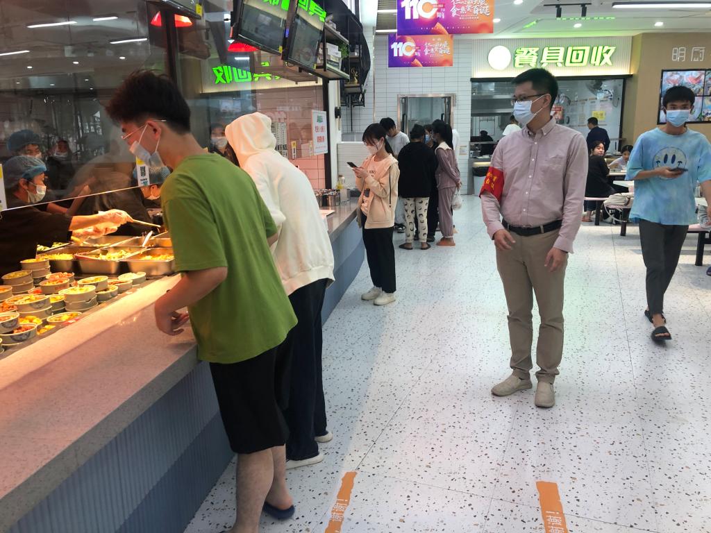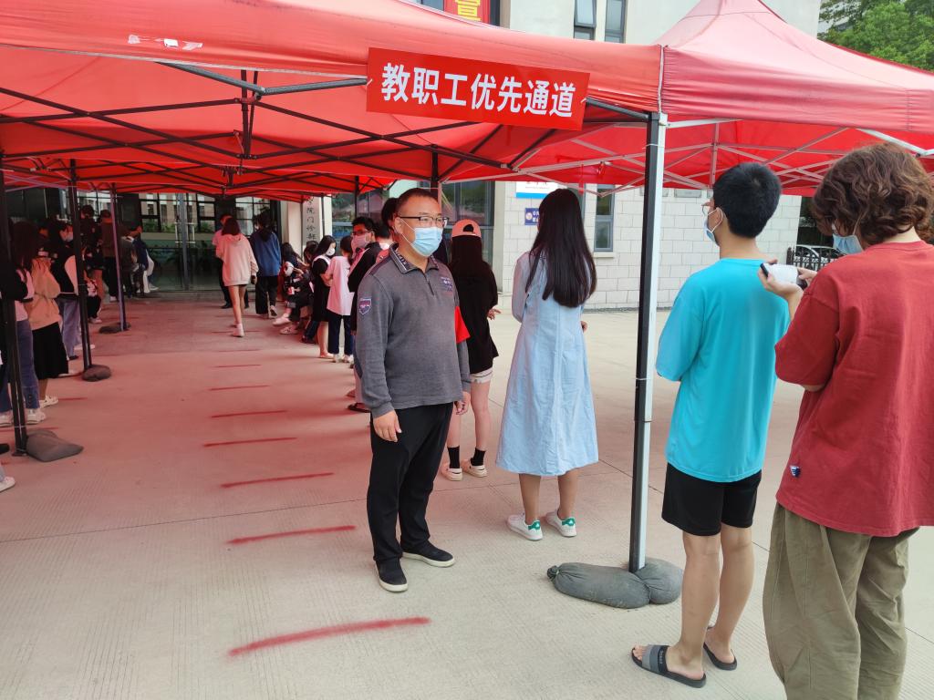 机关党员和辅导员在核酸检测点维持秩序