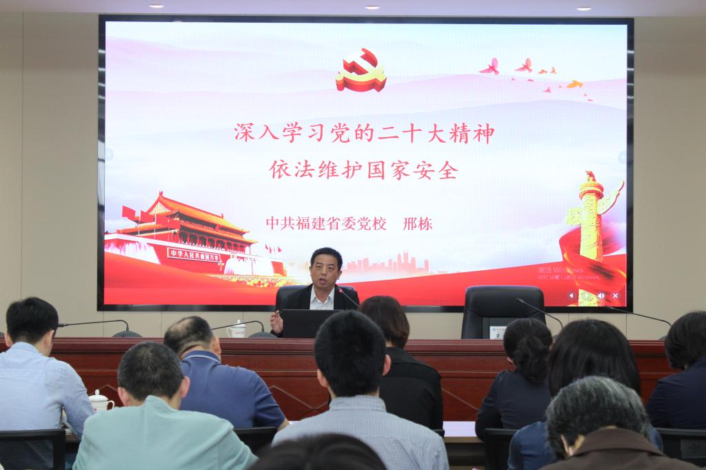 邢栋博士作“深入学习贯彻党的二十大精神,依法维护国家安全”专题辅导报告。他从党的二十大报告对法治现代化的内容重构、国家安全法治现代化的基本特征、国家安全法治现代化的路径探索三大方面展开,结合诸多实际案例讲解了总体国家安全观,内涵丰富,逻辑清晰。