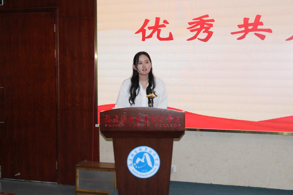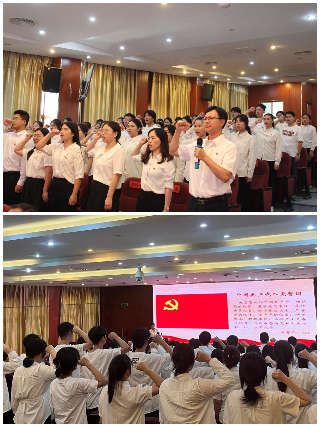 护理学院青年教师林晓琼作为优秀共产党员代表发言,她结合自身经历,分享了她在护理教育和社会服务如何用专业知识和技能服务群众、引领学生前行,并表示未来将不忘初心、坚守誓言、牢记使命、奋勇向前,为学校发展和学生培养作出更大的贡献。在公共卫生与健康管理学院党委书记叶海的带领下,近五十名新党员面对党旗进行了庄严的宣誓,表达了他们坚定不移跟党走、为共产主义事业奋斗终身的决心和信念。