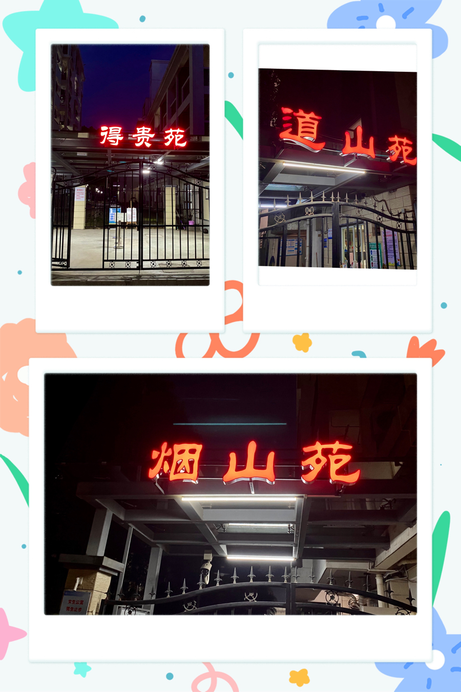 苑门上方的LED红色发光字,在夜色里显得格外靓丽而温馨。