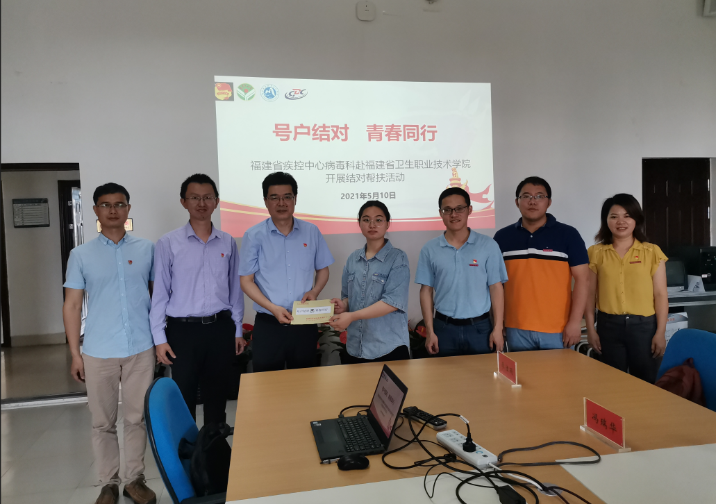 2021年5月10日下午,福建省疾病预防控制中心病毒科“青年文明号”创建小组到我系开展“号户结对 青春同行”资助活动,疾控中心传染病防治所副所长翁育伟,中心党办副主任、团委书记黄萌,病毒科青年文明号号手张炎华,健康管理系党总支书记黄曦,党总支副书记吴燕玲,副主任李宏,预防医学教研室揭金花、李丹,辅导员冯瑞华及受资助的18级预防医学专业廖佳雨同学参加了本次活动,活动由黄曦书记主持。