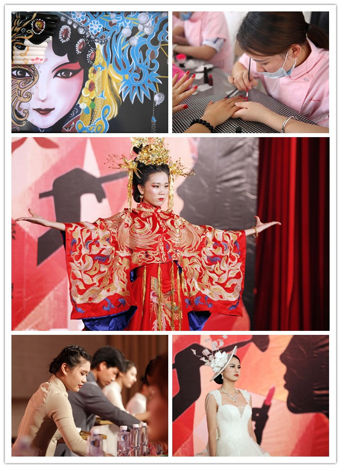 在毕业设计成果展晚会上,同学们将这三年的学习倾力展现于此,欧莎风格、森系新娘、韩式白纱、中式新娘等各类型彩妆走秀引起现场的阵阵欢呼,模特们曼妙的身姿,精美的服饰和精致的妆容,在绚烂的灯光下,展现出一场空前的视觉盛宴。