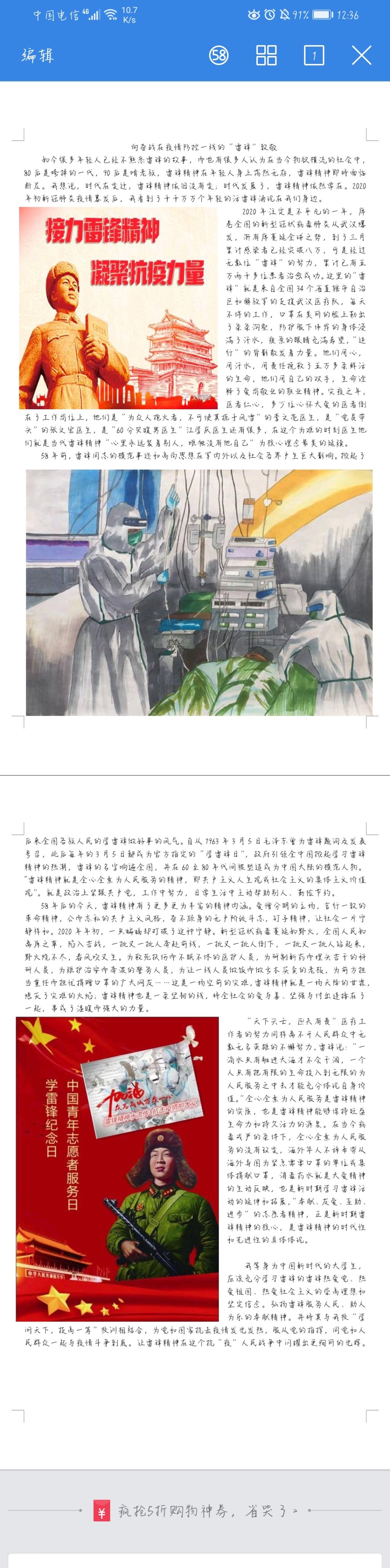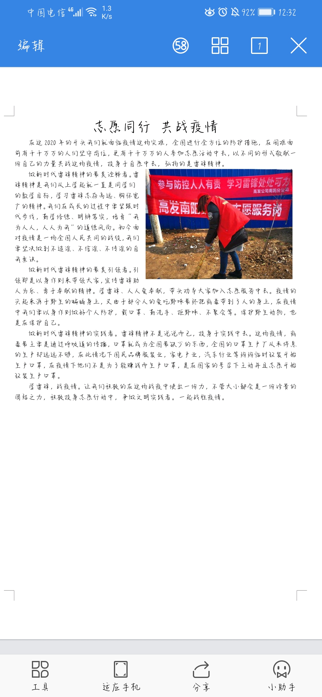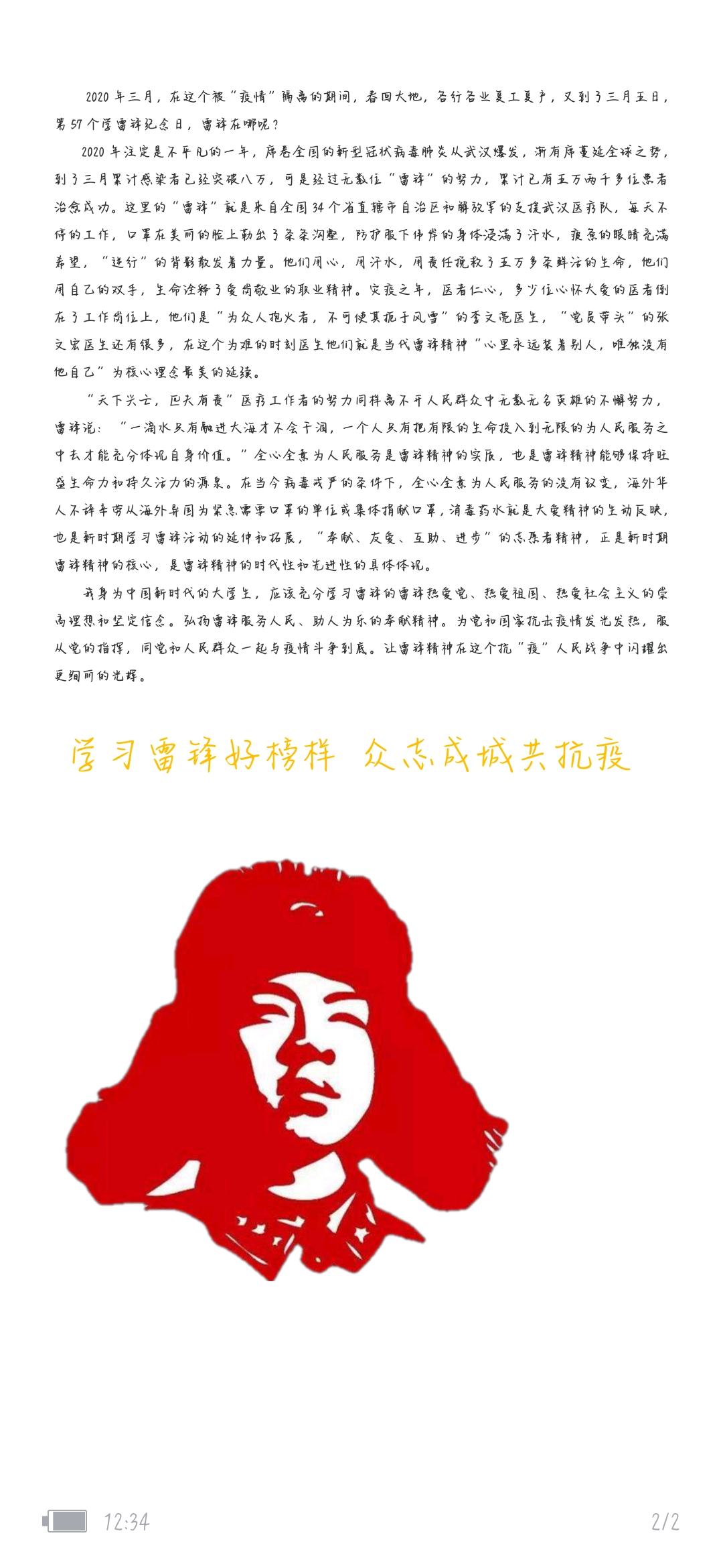 通过此次线上征文比赛使同学们认识到抗击疫情需要全社会的共同参与,雷锋精神是中国精神的突出代表,面对突然而来的疫情,作为一名大学生,我们将传承雷锋精神,凝聚起全面抗击疫情的重要力量,奏响抗疫最强音!