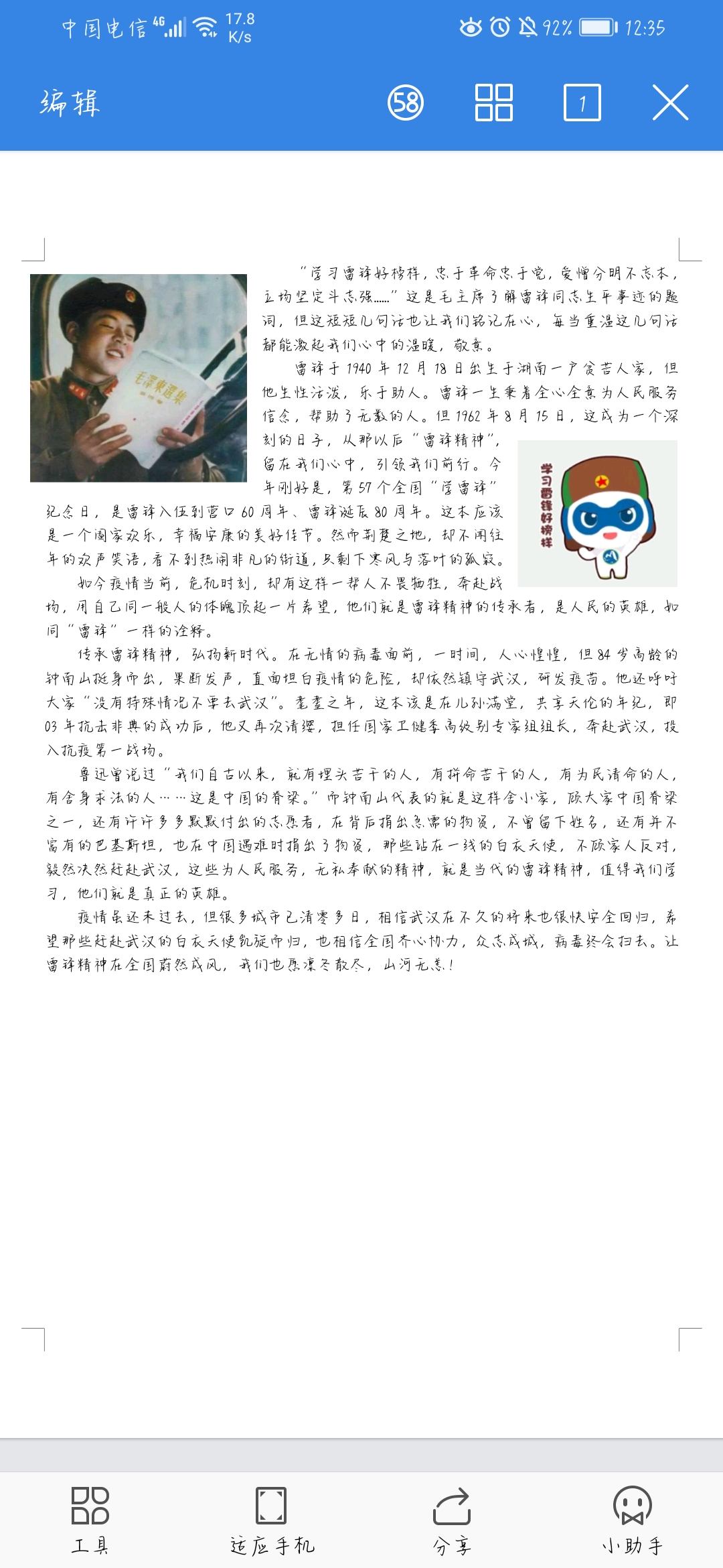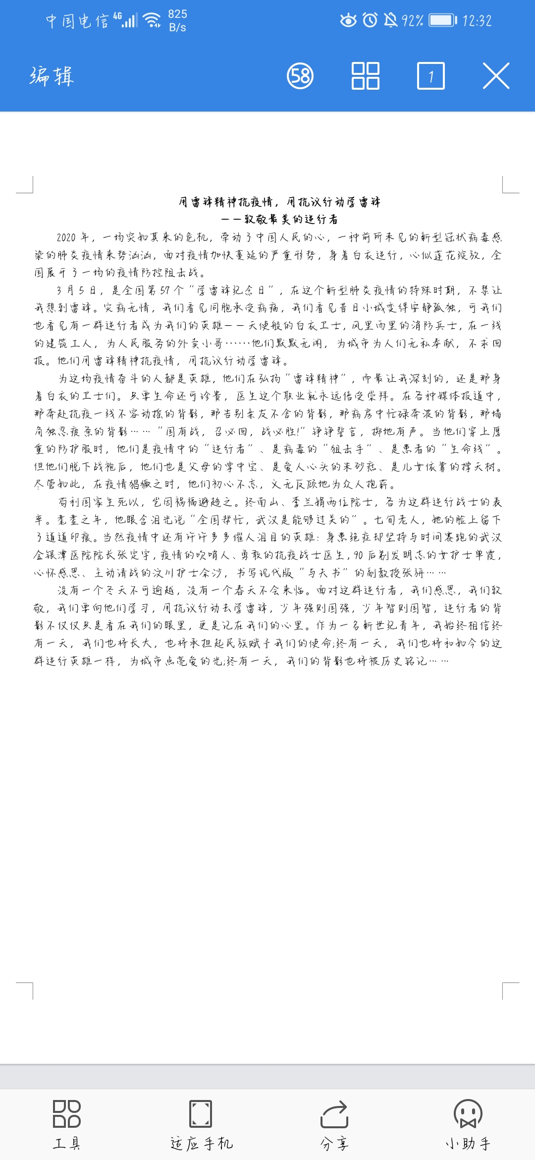 传承雷锋精神,弘扬时代新风。为深入学习社会主义核心价值观,推动文明校园建设,提升学生道德水平,我系易班于2020年3月15日开展以 “学雷锋,奋笔书写心悟”为主题的网上征文比赛,旨在以优秀文学作品凝聚大爱,凝聚民心,鼓舞士气,团结引领大家齐心协力战胜疫情。各班易班班长充分认识到此活动的重要意义,认真落实了活动方案,确保此次活动顺利开展。