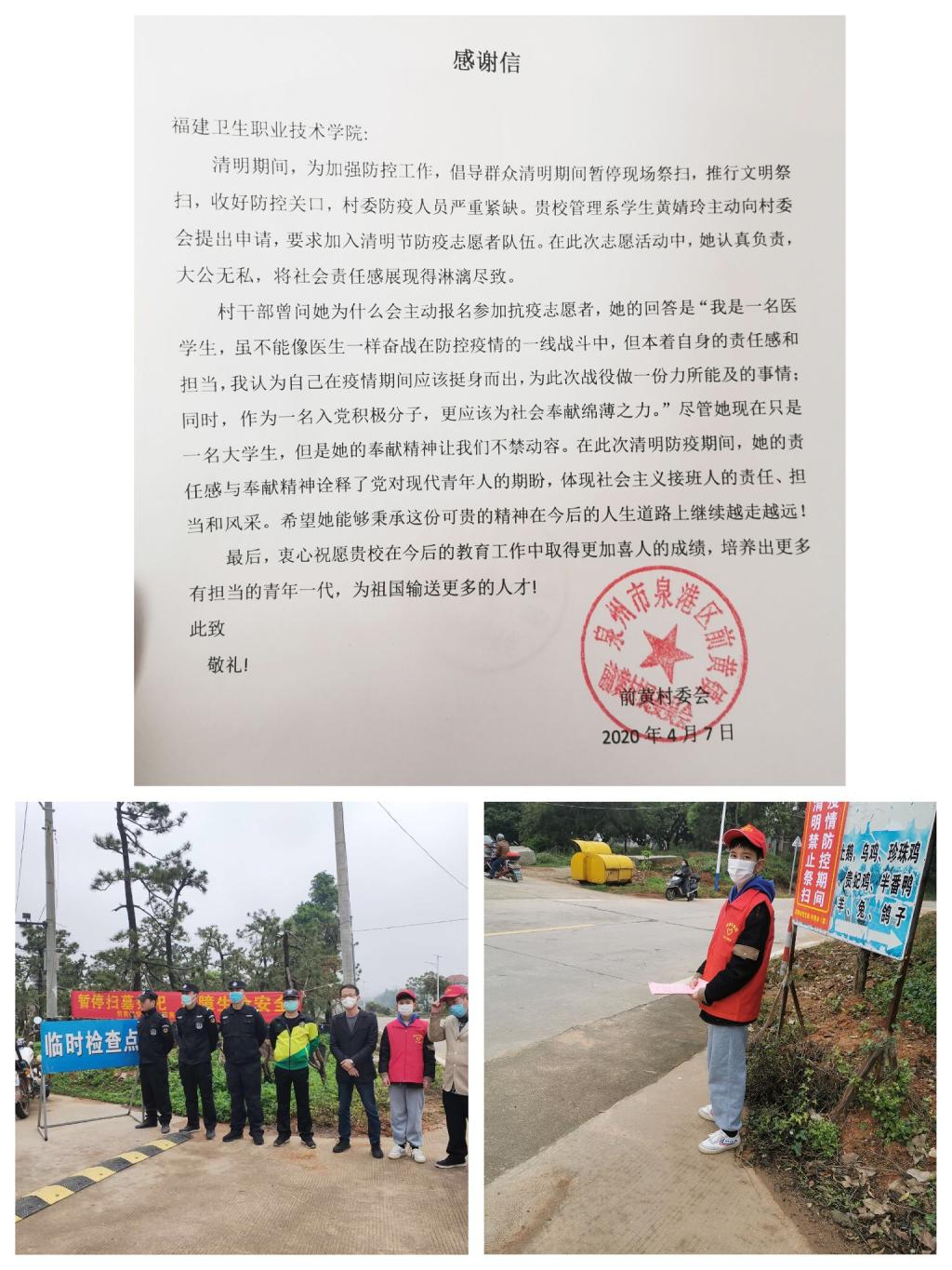 近日,我系收到了福建省泉州市泉港区前黄村委会的感谢信,感谢健康管理系19健管302班黄婧玲同学清明节期间在本村委防疫人员严重紧缺的情况下,积极响应国家号召,主动请缨,志愿成为泉州市泉港区防疫志愿者中的一员。