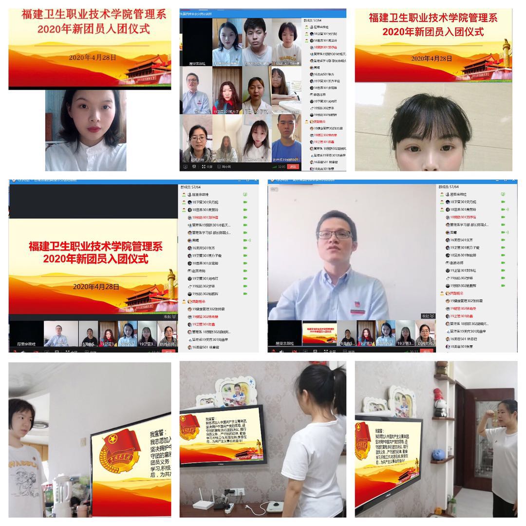 为增强新团员青年的责任感与使命感,学习和了解成为团员应该履行的义务和权利,培育和践行社会主义核心价值观。管理系于4月28日举行2020年新团员入团仪式。管理系党总支黄曦书记、系团总支书记赵茜老师、系团总支副书记许晓湖老师、各班辅导员,管理系团学干部及55名新团员参加此次线上入团仪式。