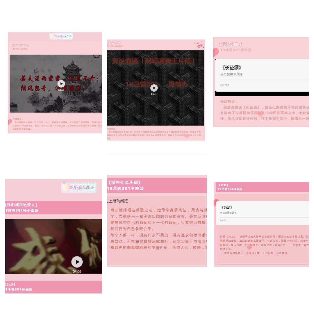 本次线上活动主要分为朗诵和歌唱两种形式,活动受到了同学们的广泛关注。在活动过程中,一句句慷慨激昂,气势恢宏的朗诵充分体现了当代大学生的青春与活力;一首首耳熟能详、热血澎湃的歌唱充分展示了我系学子乐观向上、积极奋进的昂扬斗志。在这个五四青年节的来临之际,一群意气风发的青年者用青春描绘时代的画卷,唱响时代的凯歌,扬起时代的风帆,更是营造了一种朴实深情、唱响新时代的主旋律的良好氛围,讴歌了青年学子们对中华千古风韵与历史遗产的精神面貌。以歌声传递信仰、用朗诵传承经典,每一句诗韵和歌唱都深深表现出我系学子们对中华经典的炽热追求与敬佩。最终,(1)朗诵榜:16美容501郑霏《岳阳楼记》,19卫管301周棋杰《资治通鉴》,19体保301龚宏祺《长征颂》,19预防302张小龙《日出东方》,19中医养生保健301曾余熙《大医精诚》;(2)歌唱榜:19中养301林丽辉《为龙》,19营养301李婷婷《仰望星空》,19营养301李晓慧《没有什么不同》,19营养301李梦婷《阳光总在风雨后》,19营养301杨少睿捷《我们都是追梦人》作品脱颖而出。