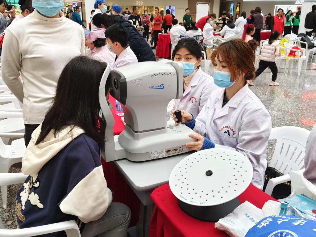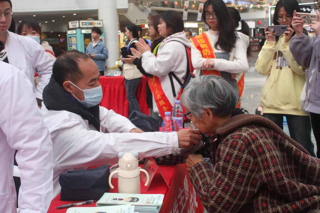 舞台下,游戏互动区与健康服务区同样精彩纷呈。志愿者巧妙地将结核防治知识融入 “直击结核要害”(投壶游戏)、“结核知识对对碰” 等趣味游戏中,同时还设置了绘画、中医(植物)拓印、创意扭扭棒等特色活动,吸引了现场观众踊跃参与。这些别出心裁的游戏,有效地增强了群众的健康意识。为切实满足群众的健康需求,支部特邀多家医院及社区卫生服务中心开展健康义诊。支部师生充分发挥专业优势,提供面部皮肤测试、眼健康检查等多样化健康咨询服务,同步进行海姆立克急救法、心肺复苏技能的演示教学,以丰富多元的服务形式,提升民众的健康管理意识与素养。
