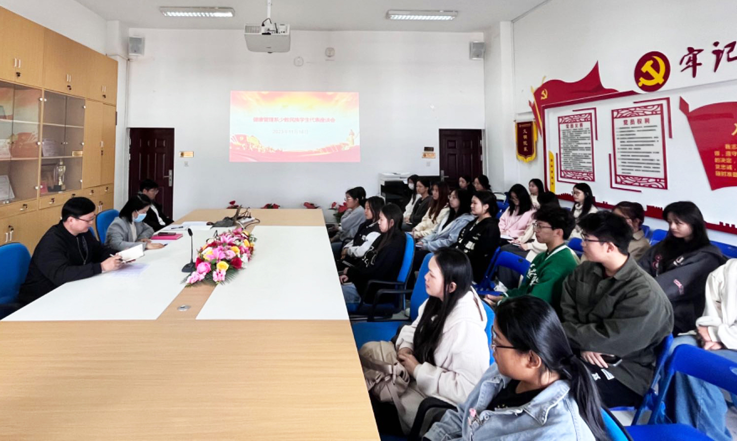 为深入了解我系少数民族学生在学习和生活方面的确切需求,进一步加强与少数民族学生沟通交流,铸牢中华民族共同体意识,促进学生成长成才。11月16日上午,健康管理系在系部会议室召开少数民族学生代表座谈会,健康管理系党总支书记叶海、副书记董东以及各年级少数民族学生代表参加本次座谈会。