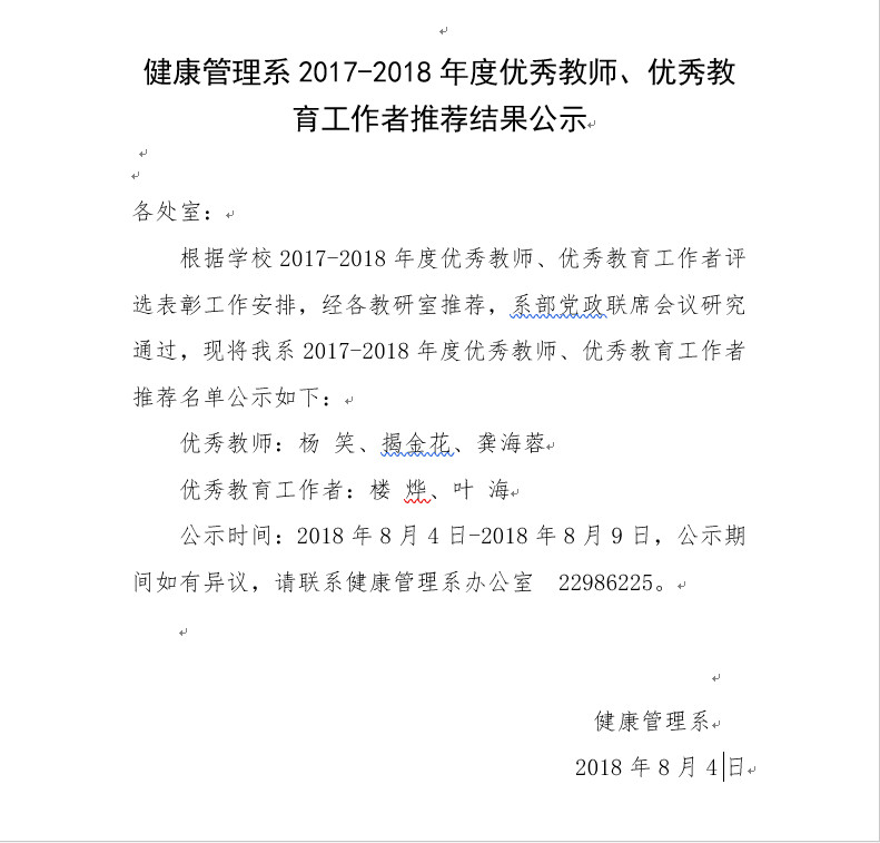 健康管理系2017-2018年度优秀教师、优秀教育工作者推荐结果公示