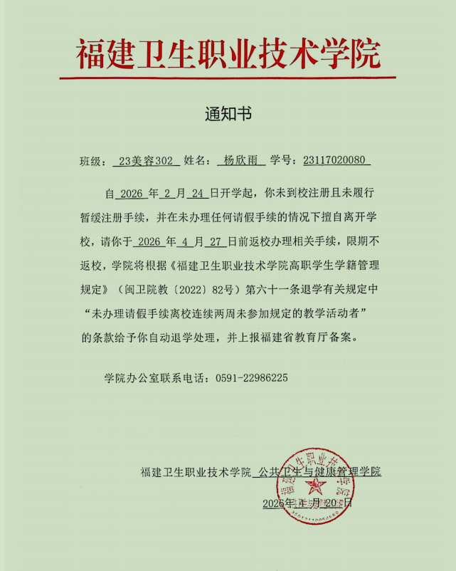 23美容302杨雨欣同学限期返校的通知