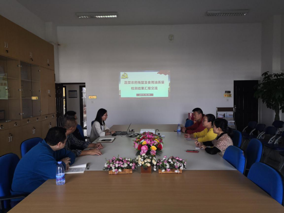 会上,管理系第一党支部组织委员李丹对检测结果进行汇报,包括随机抽取的第一食堂、明源食堂的主要当季蔬菜如空心菜、包菜、生姜、豆芽、黄瓜、洋葱等的农药残留以及食用油酸价、过氧化值,并从营养和安全角度提出改进建议。