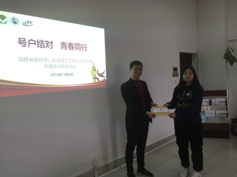 2019年12月6日上午,福建省疾病预防控制中心病毒科“青年文明号”创建小组到健康管理系开展“号户结对青春同行”资助活动,省疾控中心传染病防治所副书记、病毒科科长翁育伟,中心党办副主任、团委书记黄萌,病毒科青年文明号号手张炎华,健康管理系庄海林主任,健康管理系党总支艾松军书记,预防医学教研室揭金花老师、李丹老师,辅导员赵茜老师及受资助的18预防301班廖佳雨同学参加本次活动,活动由艾松军书记主持。