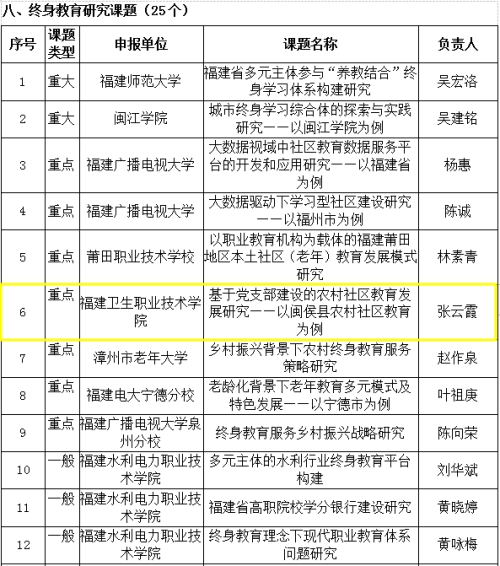 根据《福建省教育厅福建省财政厅关于开展2018-2020年福建省终身教育重点项目建设工作的通知》(闽教职成〔2018〕36号)文件精神,我系教师党员张云霞老师积极申报2019年课题项目,所主持的《基于党支部建设的农村社区教育发展研究——以闽侯县农村社区教育为例》课题于近日入选第二批全省终身教育研究重点课题,特此祝贺!