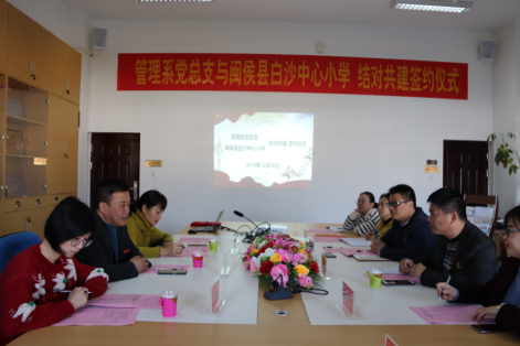 为推动城乡教育均衡发展,服务乡村振兴战略,助力脱贫攻坚,12月26日上午,管理系党总支与白沙中心小学结对共建签约仪式在管理系会议室举行。白沙中心小学校长李维铨、副校长林昌芳、德育处主任陈秀金、德育处副主任夏林萍、学院党委委员、陈贞健副校长、管理系党总支书记艾松军、管理系主任庄海林、管理系党总支纪检委员、办公室主任李淼淼、管理系党总支专职组织员张云霞、管理系党总支宣传委员、第一党支部副书记揭金花、第二党支部书记、团总支书记冯瑞华、管理系团总支副书记赵茜参加会议。会议由管理系党总支书记艾松军主持。