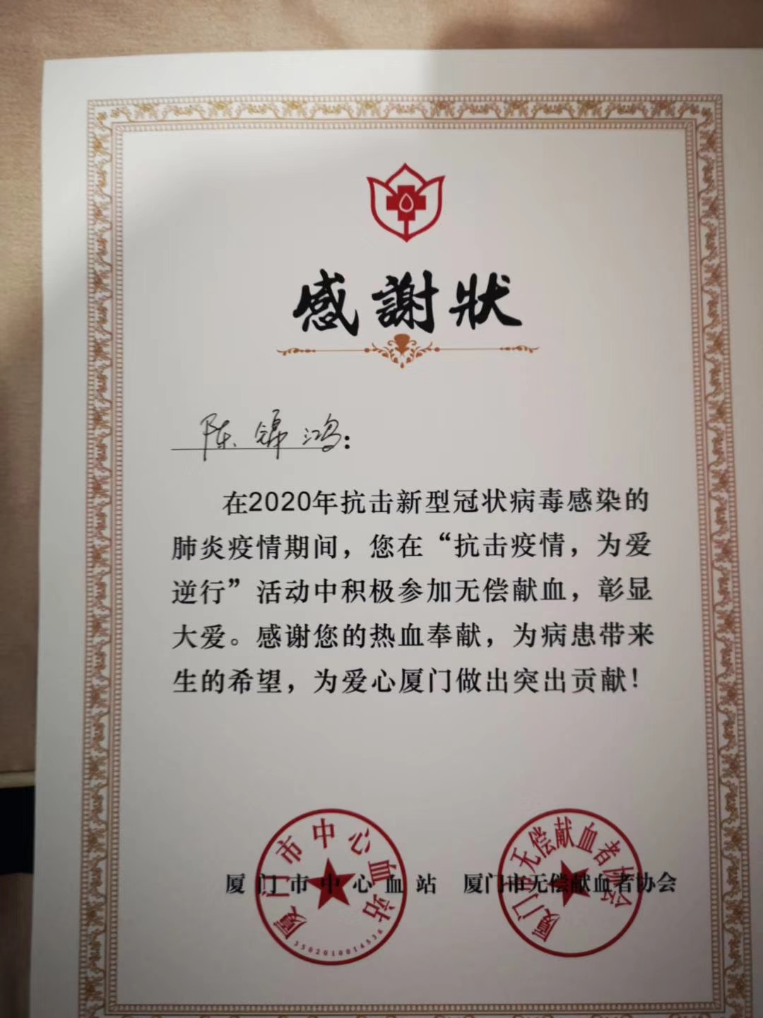 “尊敬的献血者:全力疫情防控、血液库存告急,患者亟待挽救生命!目前您的献血间隔已满6个月,真诚地期盼您再次奉献爱心,在此谨代表患者向您致敬!”近日,陈锦鸿的手机收到了福建省血液中心发来的这样一条短信,虽然待在家里不出门就是为社会做贡献,但在确保自己满足献血的一切条件后,想为这次抗击疫情做点事的他第一时间来到厦门市湖里区SM城市广场献血站献血400CC,用自己力所能及的方式为抗击疫情做贡献。据了解,上大学至今他已累计献血1200CC。