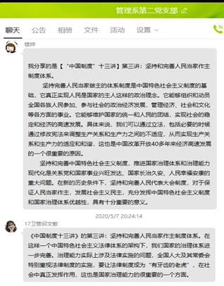 5月7日,管理系第二党支部依托学习强国平台开展以“治国理政大家读”为主题的系列活动,系统学习贯彻党的十九届四中全会精神,更全面、深入的学习中国特色社会主义制度和国家治理体系优势,为决战决胜脱贫攻坚战和全面建成小康社会增强制度自信。