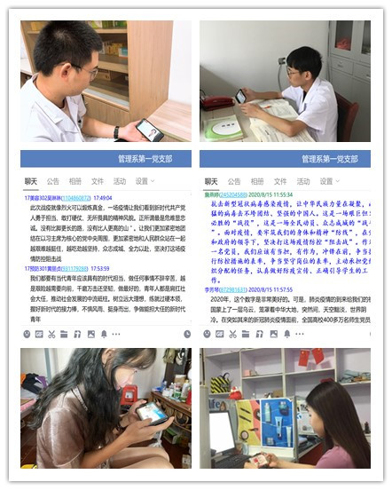 视频观看后,党员们在线交流,发表感想。管理系第一党支部宣传委员詹燕婷表示,抗击新型冠状病毒感染疫情,让中华民族力量在凝聚,凶猛的病毒击不垮团结、坚强的中国人。这是一场艰巨但又必胜的“战役”,这是一场全民动员、众志成城的“战斗”。面对疫情,要牢筑我们的身体和精神“防线”,在党和政府的领导下,坚决打这场疫情防控阻击战。作为一名党员,我们应该有担当,有作为,冲锋在前,争当执行防控措施的表率,争当坚守岗位的表率,主动承担党组织分配的任务,认真做好防疫宣传、正确引导学生的工作。学生预备党员吴琳琳表示,此次战疫就像烈火可以锻炼真金,一场疫情让我们看到新时代共产党人勇于担当、敢打硬仗、无所畏惧的精神风貌。正所谓最危难显忠诚。让我们更加紧密团结地在以习近平同志为核心的党中央周围,更加紧密地和人民群众站在一起,越艰难越挺住,越吃劲越坚持,众志成城、全力以赴。