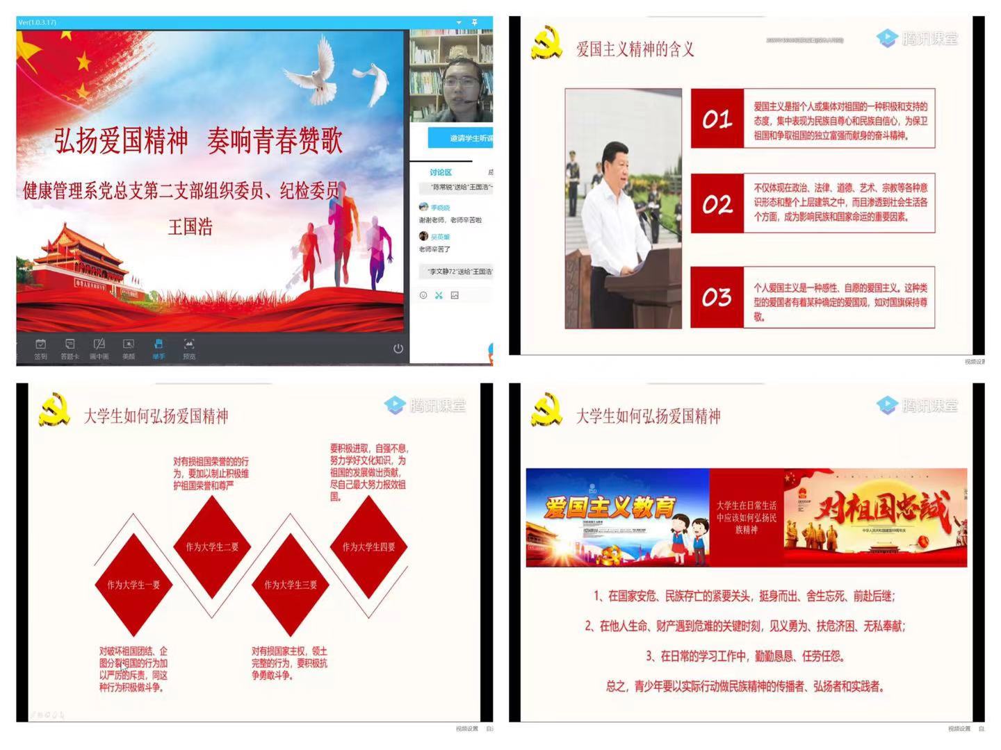为进一步提高入党积极分子的政治理论水平,强化政治素养,把好发展党员入口关。在2021年2月25日上午,健康管理系党总支第二支部组织委员、纪检委员王国浩老师为本期学员开展了一堂生动的业余分党校党课,旨在通过此次以《弘扬爱国精神,奏响青春之歌》为主题的分党校培训课程,让分党校学员们能够深深感受到爱国主义精神,增强爱国主义情怀,自强不息,报效祖国。
