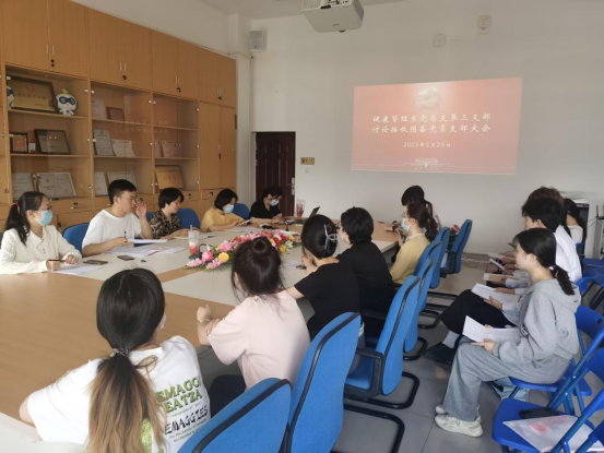 5月25日,健康管理系党总支第三支部于图书馆五楼会议室召开接收预备党员大会,会议就曾学华等6名发展对象入党问题展开了充分讨论,党支部书记王开晔同志主持会议。