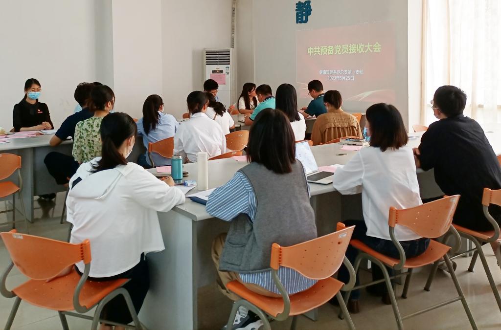 2023年5月25日下午,健康管理系党总支第一支部召开预备党员接收大会。会议由健康管理系党总支第一支部书记林麒同志主持,对谢隆腾、林雅娜、郑萍萍3名发展对象接收为预备党员进行讨论和表决。