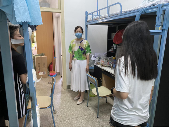 在深入学生宿舍过程中,李美华副书记向学生细致了解返校后生活状况以及学生实习前岗前培训情况,并询问学生的有无需要学校解决的困难,并且对学生做好疫情防控进行了强调,叮嘱同学们注意戴好口罩做好个人防护。