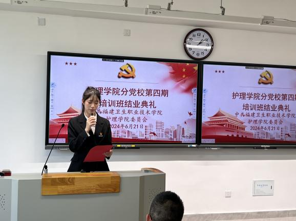 2024年6月21日,护理学院党总支分党校第四期培训班结业典礼在护理学院第四阶梯教室顺利举行。此次大会邀请了学院党总支副书记林来元、培训班全体学员参加,由党总支专职组员许慧琼主持。