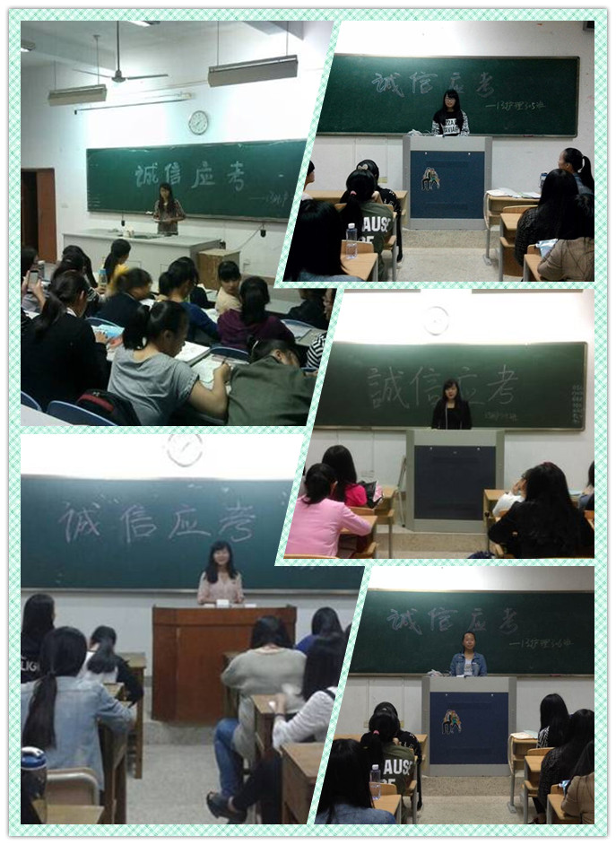 每个班级都宣读了诚信应考倡议书,由学习委员组织学习《学生违纪处理规定》中有关考试纪律规定、考试违纪作弊行为的认定,让同学铭记考试规章制度,严格要求自己。辅导员强调了遵守考试纪律的重要性及其处分结果的严重性。班会结束后,各个班级都组织学生进行承诺诚信应考签名活动,通过签名表明自己诚信应考的决心。