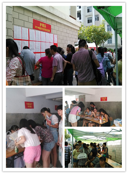 报到当天,结合护理系的实际情况,将报到处置于5号学生公寓楼下,同时,在过道外墙和各班报到办公桌上均张贴排班名单、报到流程图、学费说明等。在现场,系部领导老师耐心回答新生和家长的各种咨询,介绍护理系办学特色和相关专业的基本情况;志愿者们带着新生完成入学的各项手续。
