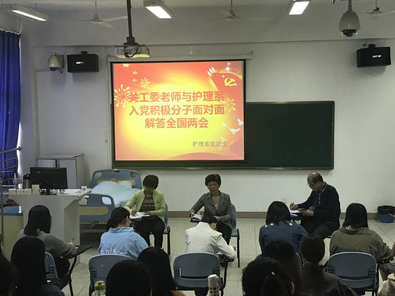 严肃书记从宪法的修改、关于选举任命习近平总书记为国家主席的宣誓、关于制定党的监察法与国际监察的有机结合、国务院机构改革、政府工作报告五个方面向护理系入党积极分子解读两会。陈雄副主任通过自身经历以及现代社会经济发展向入党积极分子共谈两会。与会入党积极分子针对两会提出一系列问题,如编制内外的差别、医患关系、三医结合、养老制度等。严肃主任和陈雄副主任耐心一一解答,并期望与会入党积极分子学好专业知识,做到知行合一。呼吁入党积极分子永远跟党走,不忘初心,牢记使命,坚定理想信念,积极投身于伟大的护理工作之中,为实现中华民族伟大复兴的中国梦不懈奋斗。