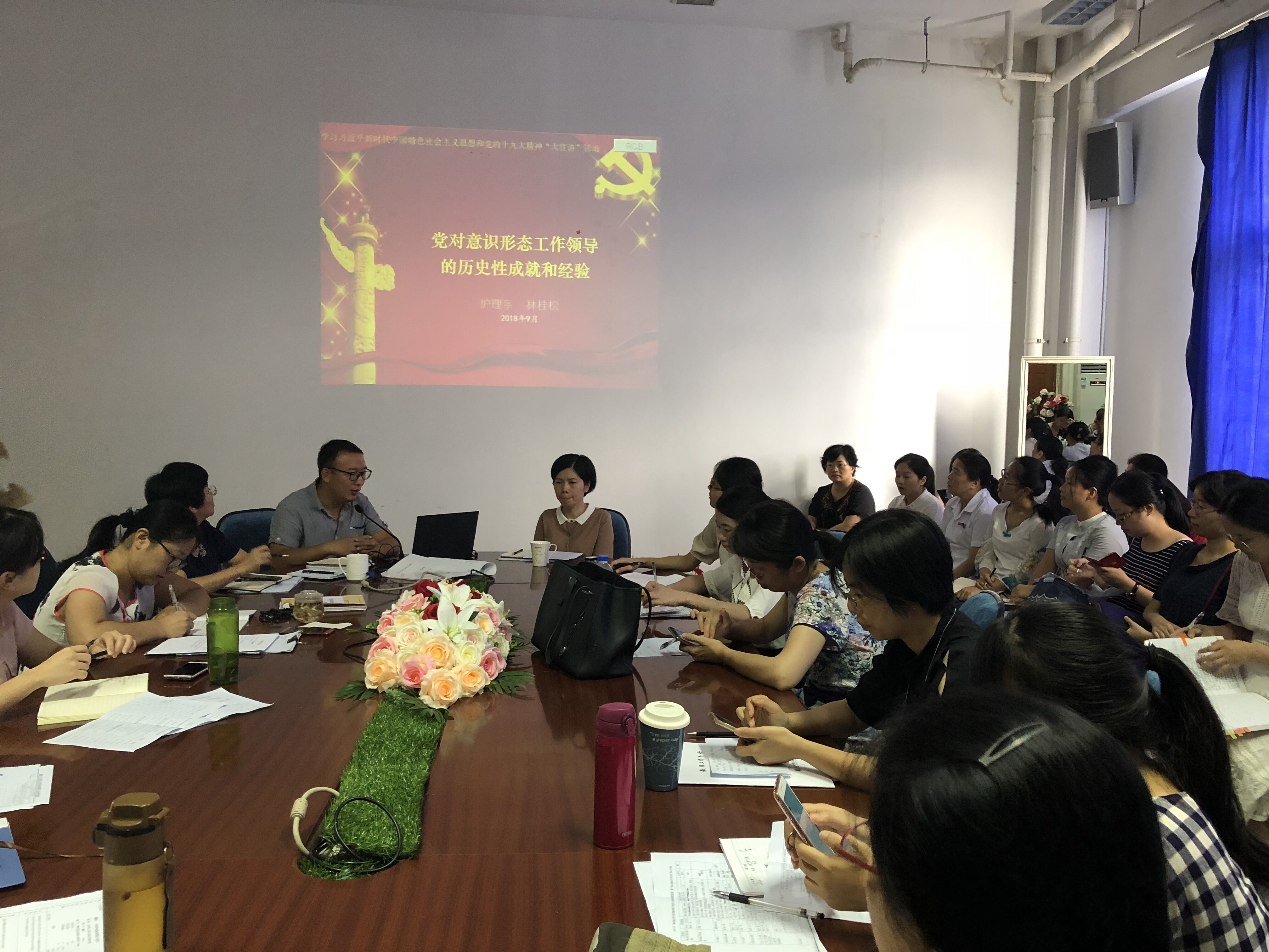 为深入学习贯彻习近平新时代中国特色社会主义思想和党的十九大精神,按照学院《开展习近平新时代中国特色社会主义思想“大宣讲”工作方案》的要求与安排,9月13日下午,护理系在301会议室举办专题党课,护理系林桂松副书记为护理系全体党员干部职工做了以“党对意识形态工作领导的历史成就和经验”为专题的党课,护理系全体教职工认真听取的党课。