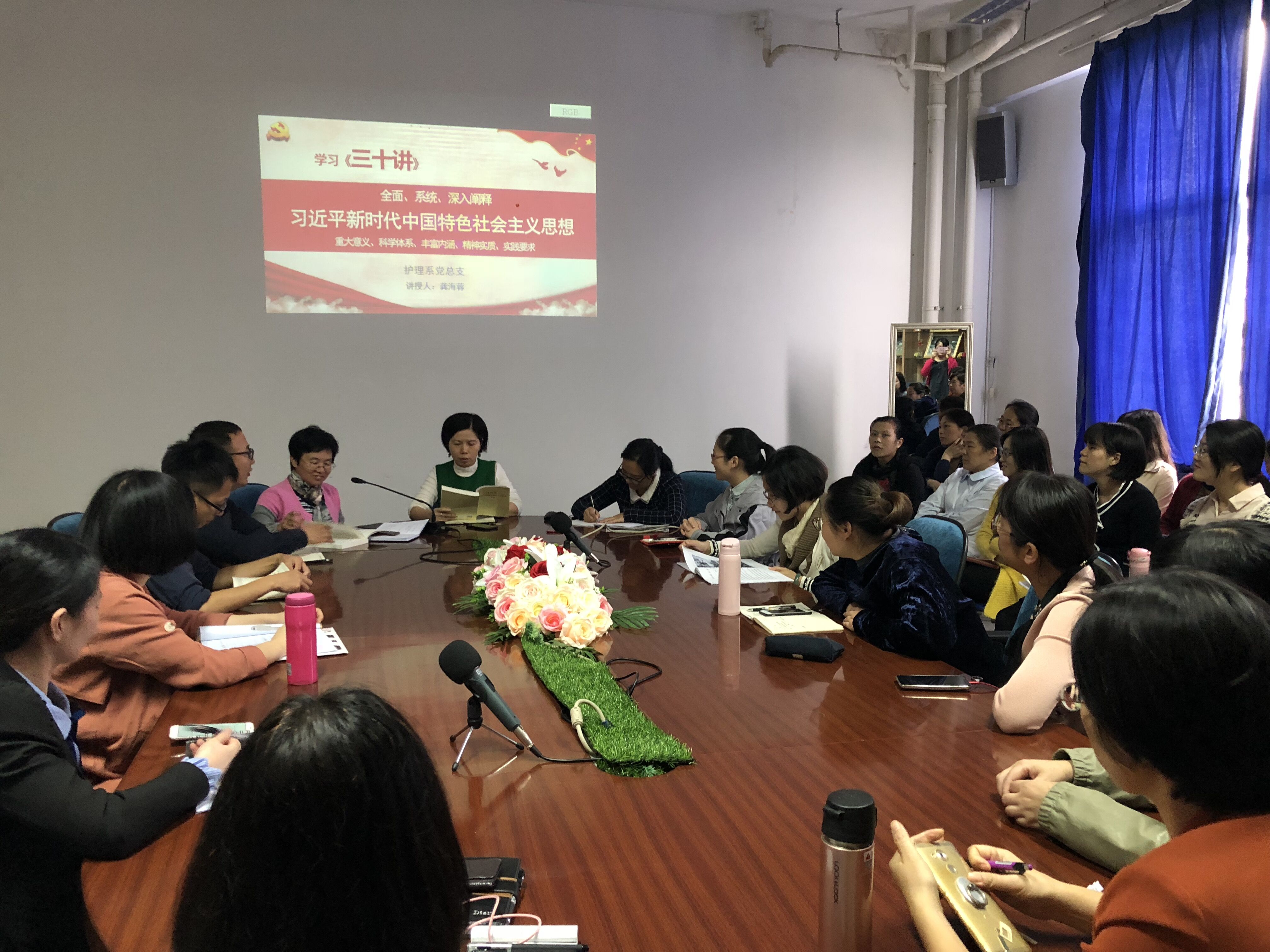 为深入贯彻落实习近平新时代中国特色社会主义思想和党的十九大精神,2018年10月18日下午,护理系在301会议室集中学习了《习近平新时代中国特色社会主义思想三十讲》的第一讲,护理系龚海蓉副主任主持并讲授,护理系全体教职工参加集中学习。