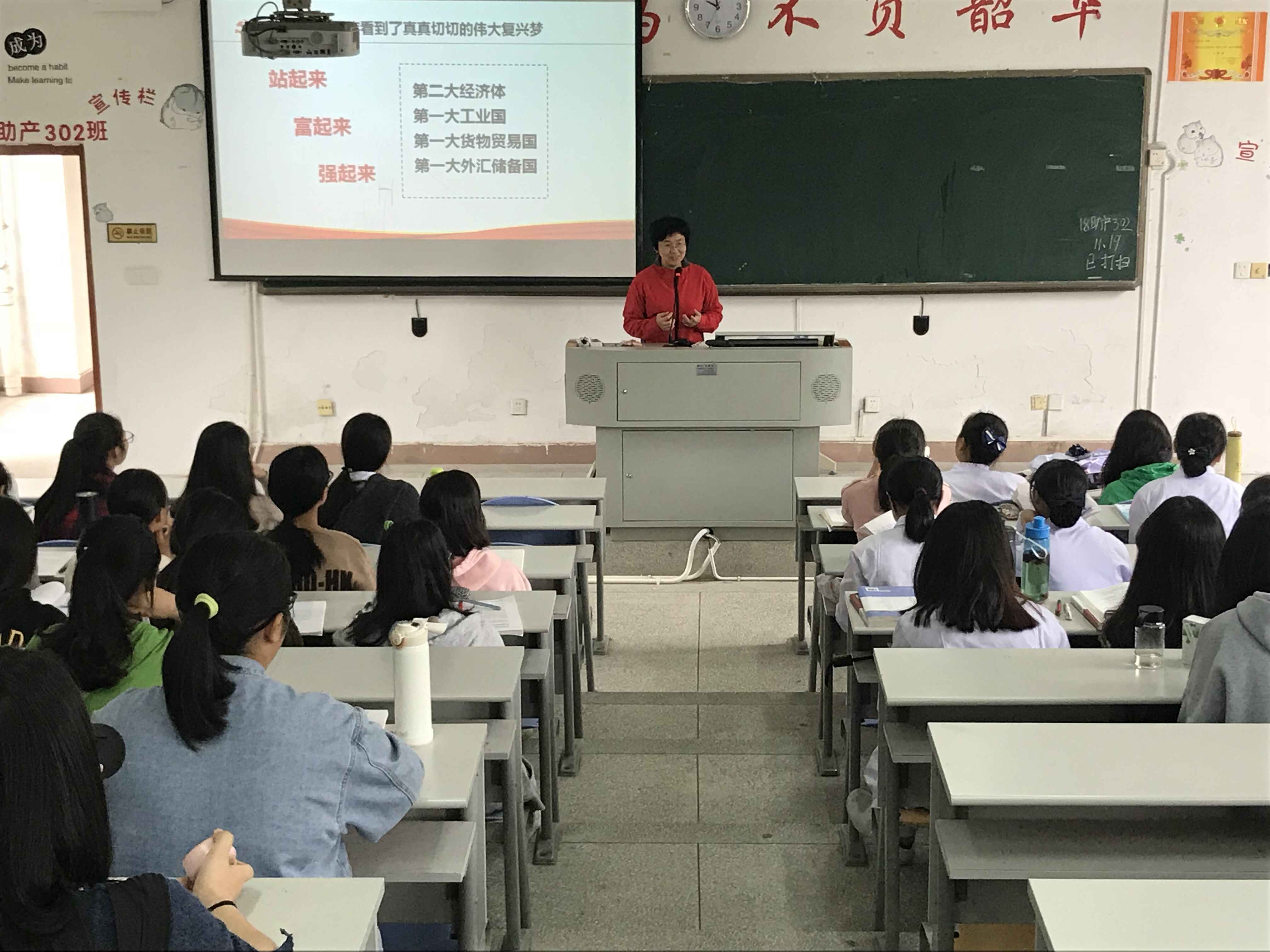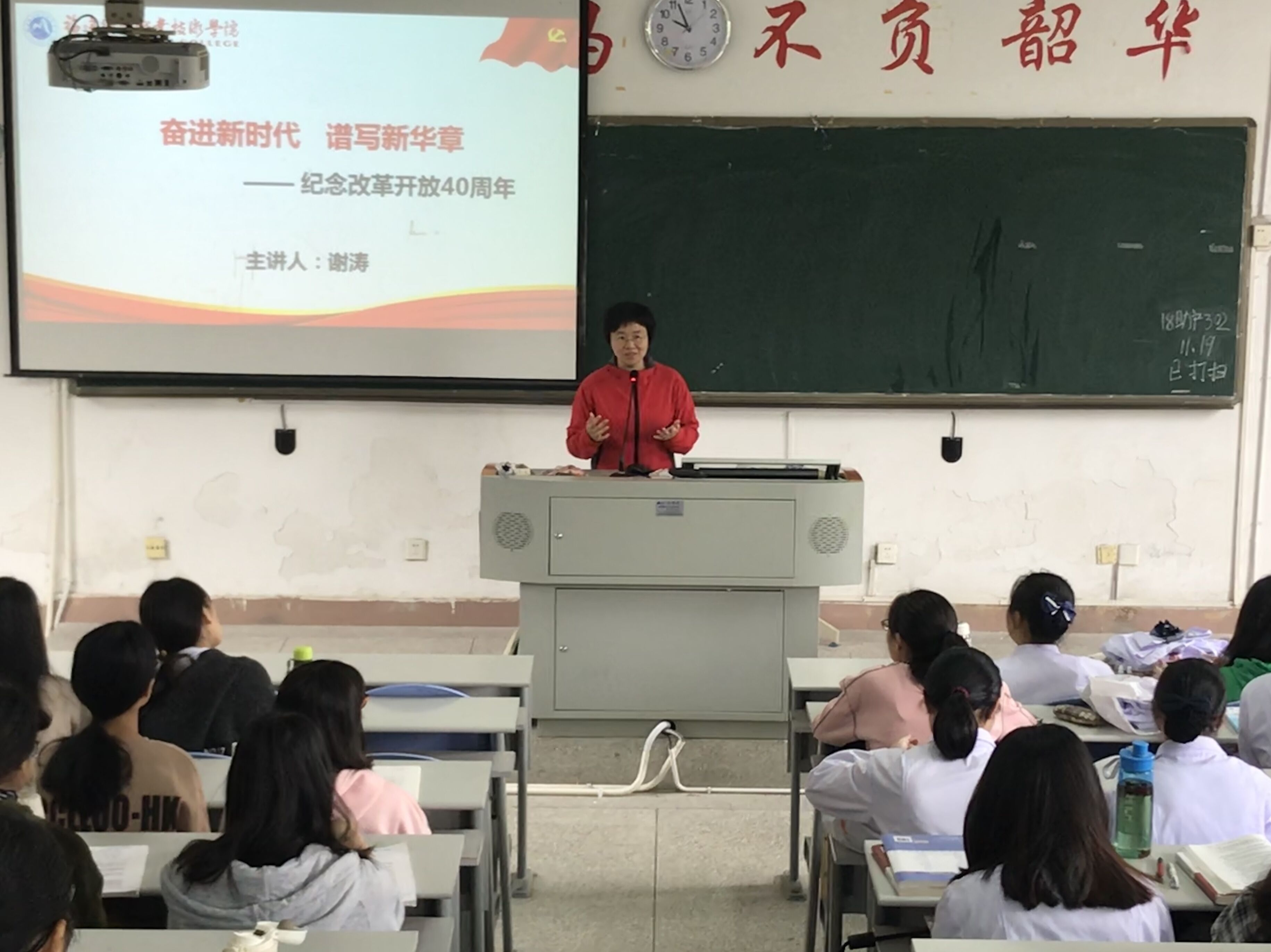 充分发挥领导干部在思想政治教育工作中的示范引领作用,全面贯彻落实党的教育方针和立德树人的根本任务,2018年11月19日,护理系谢涛书记以“奋进新时代谱写新篇章 ------庆祝改革开放40周年”为题,为护理专业学生上了一堂精彩的形势与政策课。