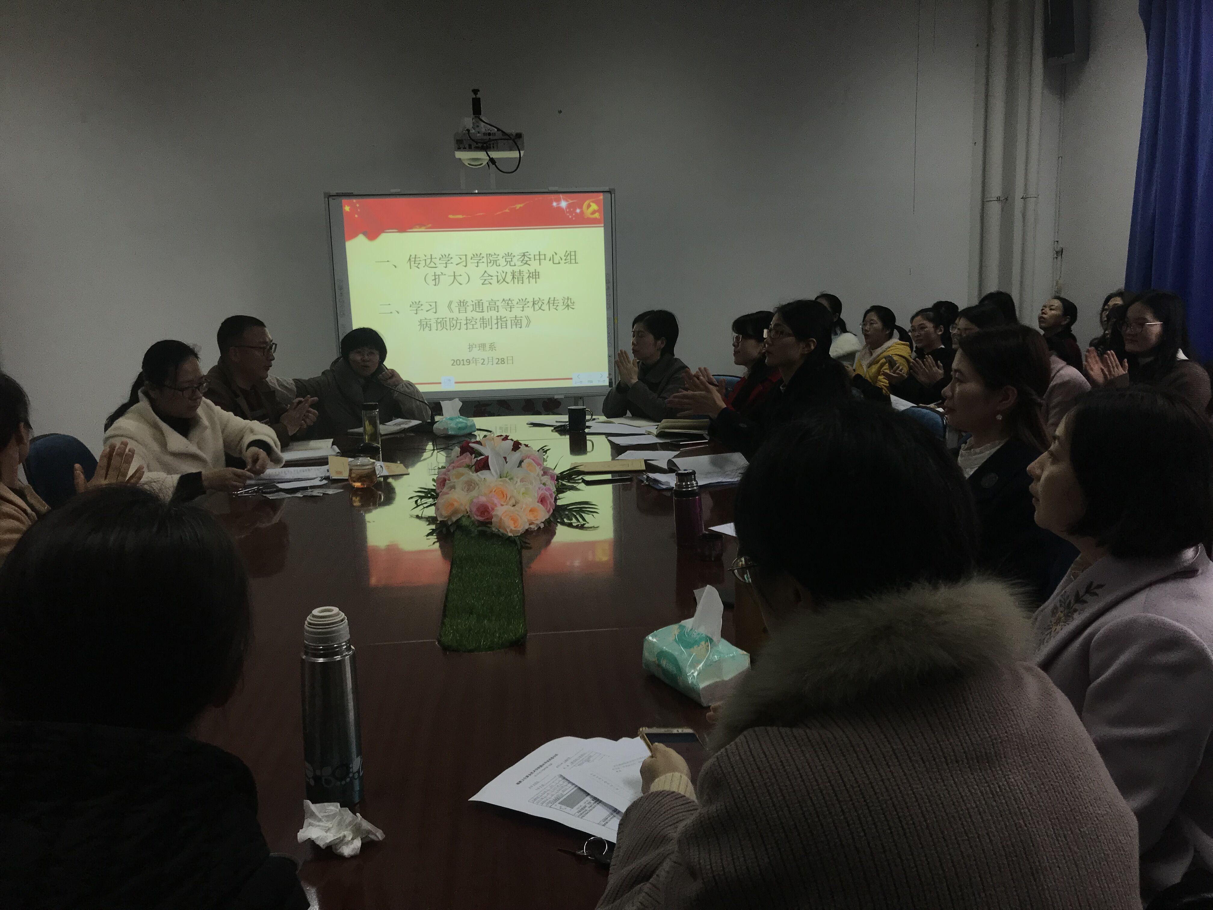 2019年2月28日,护理系组织全体教职员工于护理系301会议室学习学院党委中心组(扩大)会议精神及《普通高等学校传染病预防控制指南》。会议由护理系党总支谢涛书记主持。