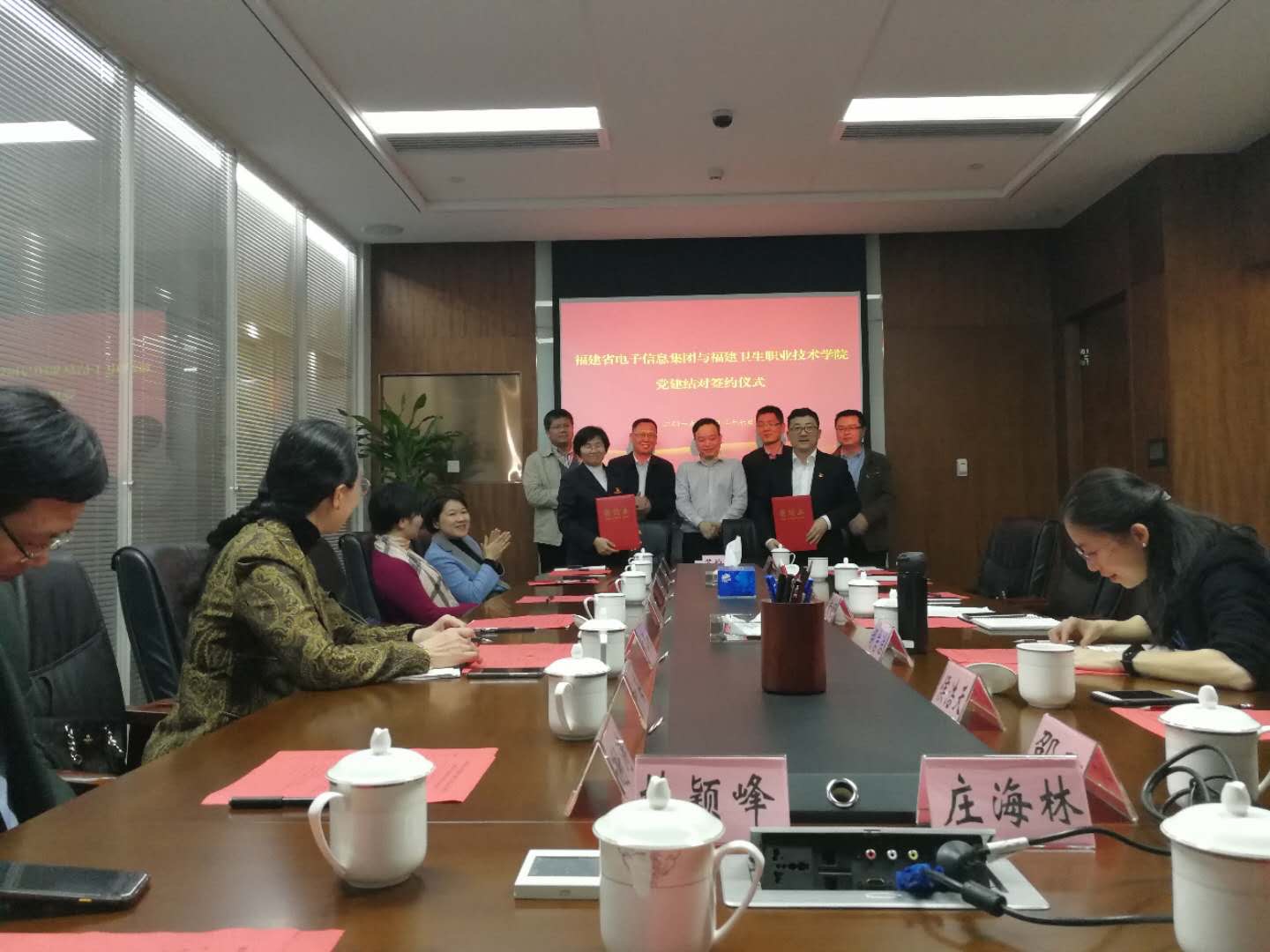 3月27日下午,护理系党总支在学院领导的带领下,赴福建省电子信息集团与其云计算党支部开展党建结对及战略合作协议签约仪式。省卫健委信息规划处刘文明主任、学院曾武祈书记、集团黄舒副总经理出席仪式并讲话,学院苏友新院长、郑翠红副院长,集团规划部胡岩洁及双方的相关领导和部门负责人共同见证签约时刻。