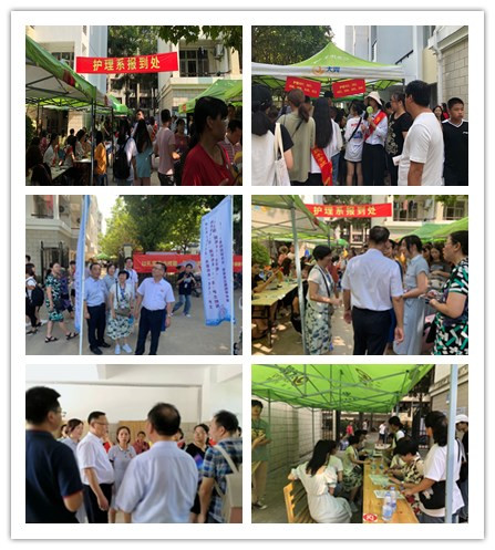 来到学校,校门口集合的是各个系的学长学姐们,护理系也在其中,新生说出自己所在系别,马上有志愿者上前,为新同学伸出援手,帮他们提行李,带领着新生和家属前往相关报到点。也许烈日骄阳下,汗水湿透了衣裳,花了妆容,而看见新生的笑容,收到感谢,身为学长学姐也是满心欣喜。